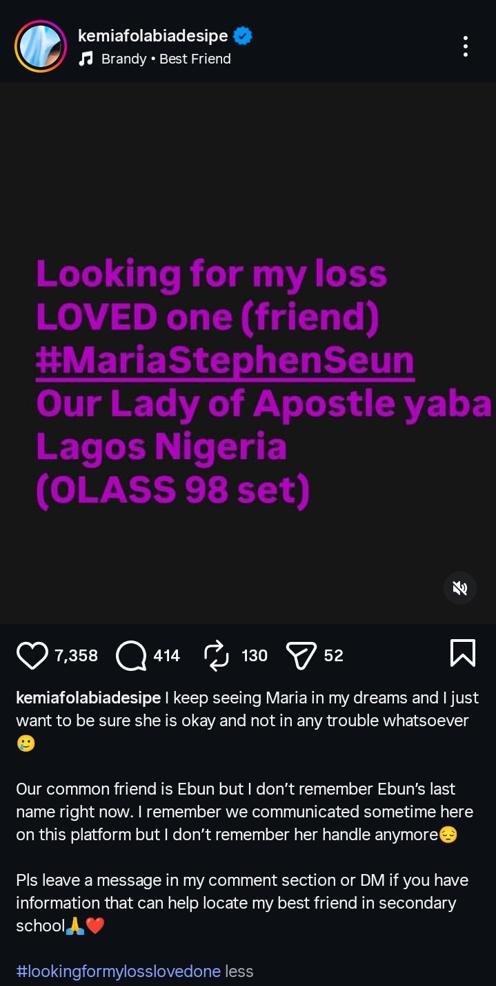 Kemi shared on social media that she has been having recurring dreams about Maria, which have raised concerns for her friend’s safety and well-being. She revealed that Maria attended Our Lady of Apostles, Yaba, Lagos (OLASS 98 set), and hopes someone may have information about her whereabouts.