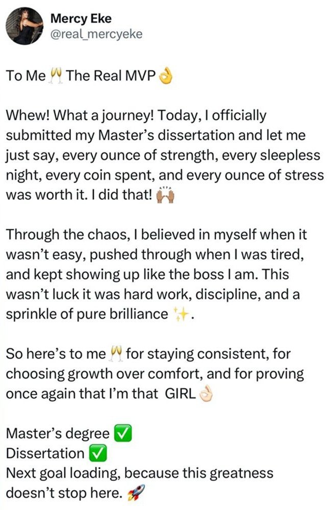 Mercy also celebrated her consistency and drive for self-improvement, writing, “Here’s to me for staying consistent, for choosing growth over comfort, and for proving once again that I’m that girl. Master’s degree ✅ Dissertation ✅ Next goal loading, because this greatness doesn’t stop here.”