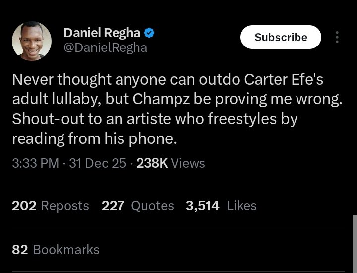 Regha responded on X, taking the trolling in stride: “Never thought anyone can outdo Carter Efe’s adult lullaby, but Champz be proving me wrong. Shout-out to an artiste who freestyles by reading from his phone.”