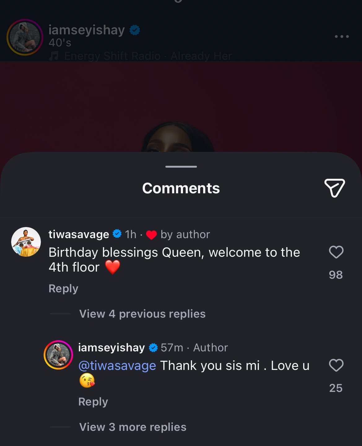 Under Seyi Shay’s birthday post, Tiwa wrote: “Birthday blessings Queen, welcome to the 4th floor.”