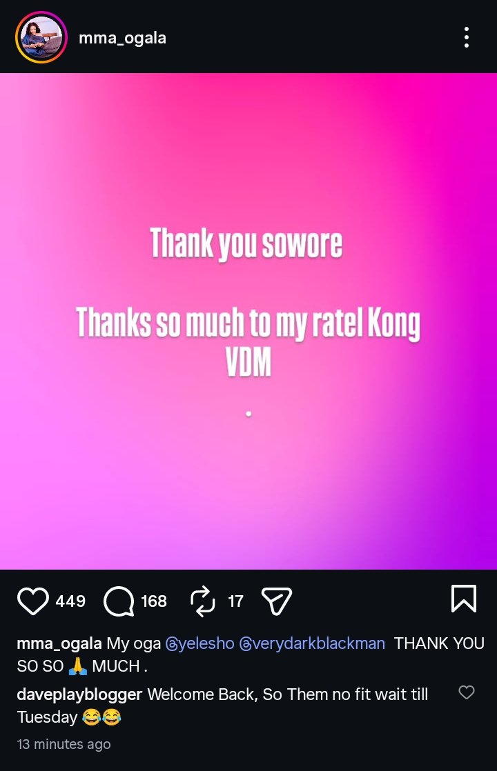 Influencer VeryDarkMan (VDM) had been outspoken in her defense, warning Pastor Okafor and hinting at releasing evidence if she was not released. Following these efforts and the support of her followers, Ogala is now back home, while discussions around the feud remain active on social media.