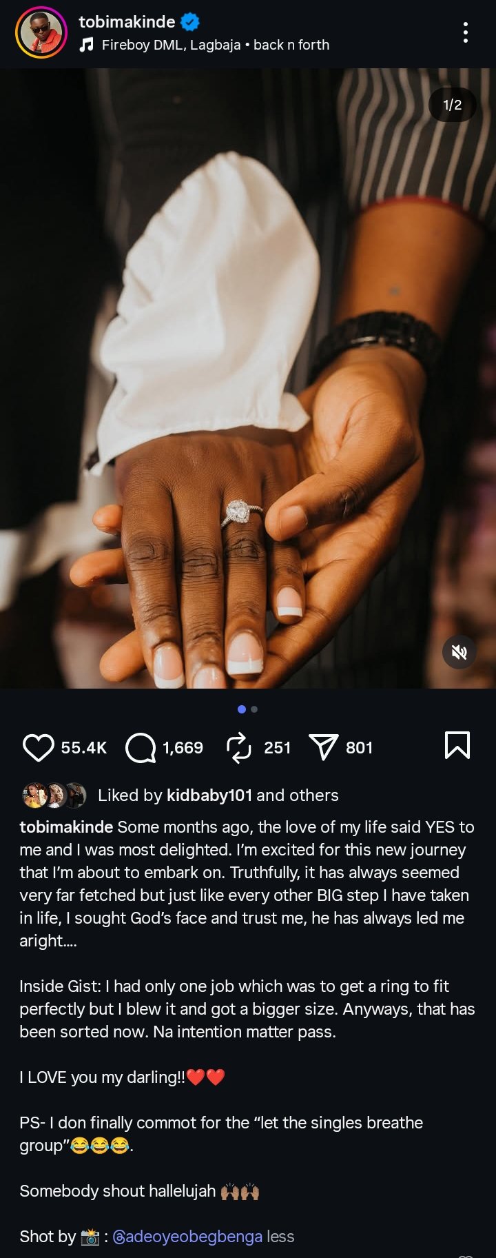 Nollywood actor Tobi Makinde is officially off the market! He thrilled fans on Instagram by announcing his engagement, sharing his excitement and heartfelt gratitude.
