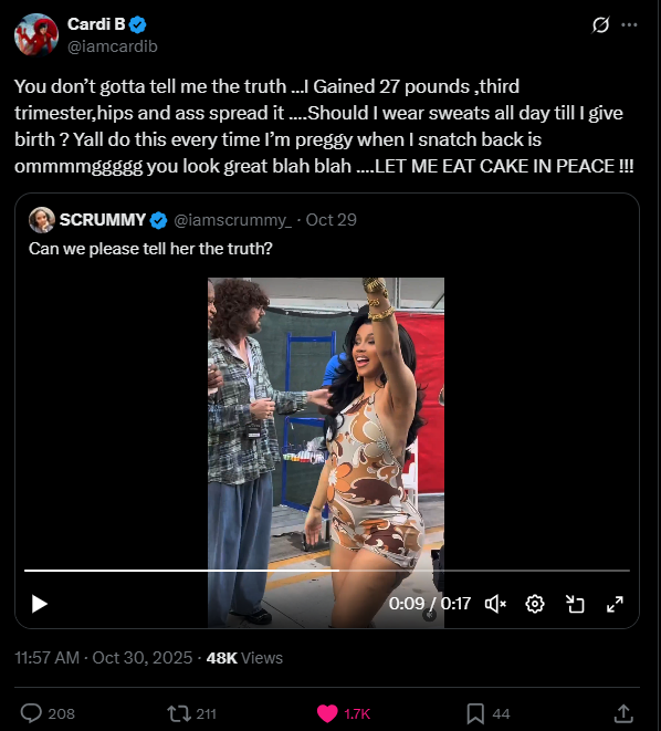 Cardi’s message served as a reminder that pregnancy comes with natural changes, and women deserve to enjoy the experience without being criticized for how they look.