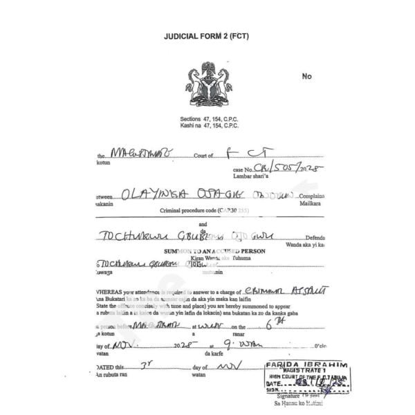 In the court document dated November 3, 2025, Chief Magistrate Farida Ibrahim directed Odumodublvck to appear before the court on November 6 to respond to the allegations.