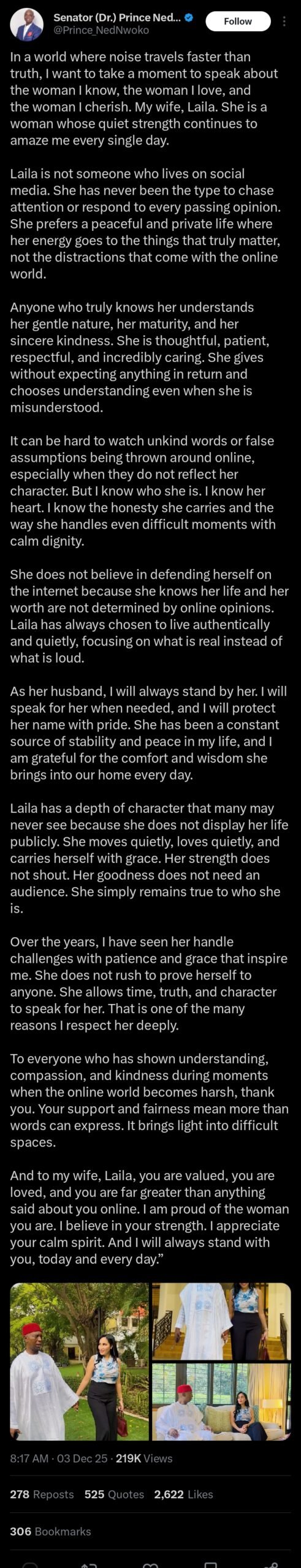 The post provides a glimpse into Nwoko’s appreciation for Laila amid public scrutiny, showcasing his dedication to her as they navigate ongoing family tensions.