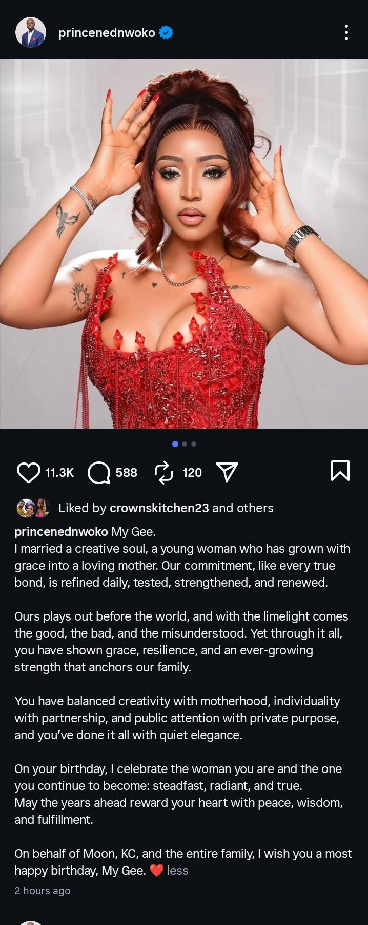 Taking to Instagram, Nwoko shared elegant photos of his wife alongside a touching note expressing admiration for her growth, creativity, and strength as both a wife and mother.