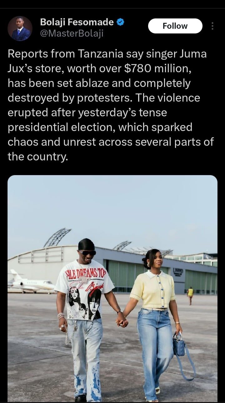 A viral post on X (formerly Twitter) alleged that Juma Jux’s store, valued at over $780 million, had been “set ablaze and completely destroyed by protesters” amid post-election chaos in several parts of Tanzania.