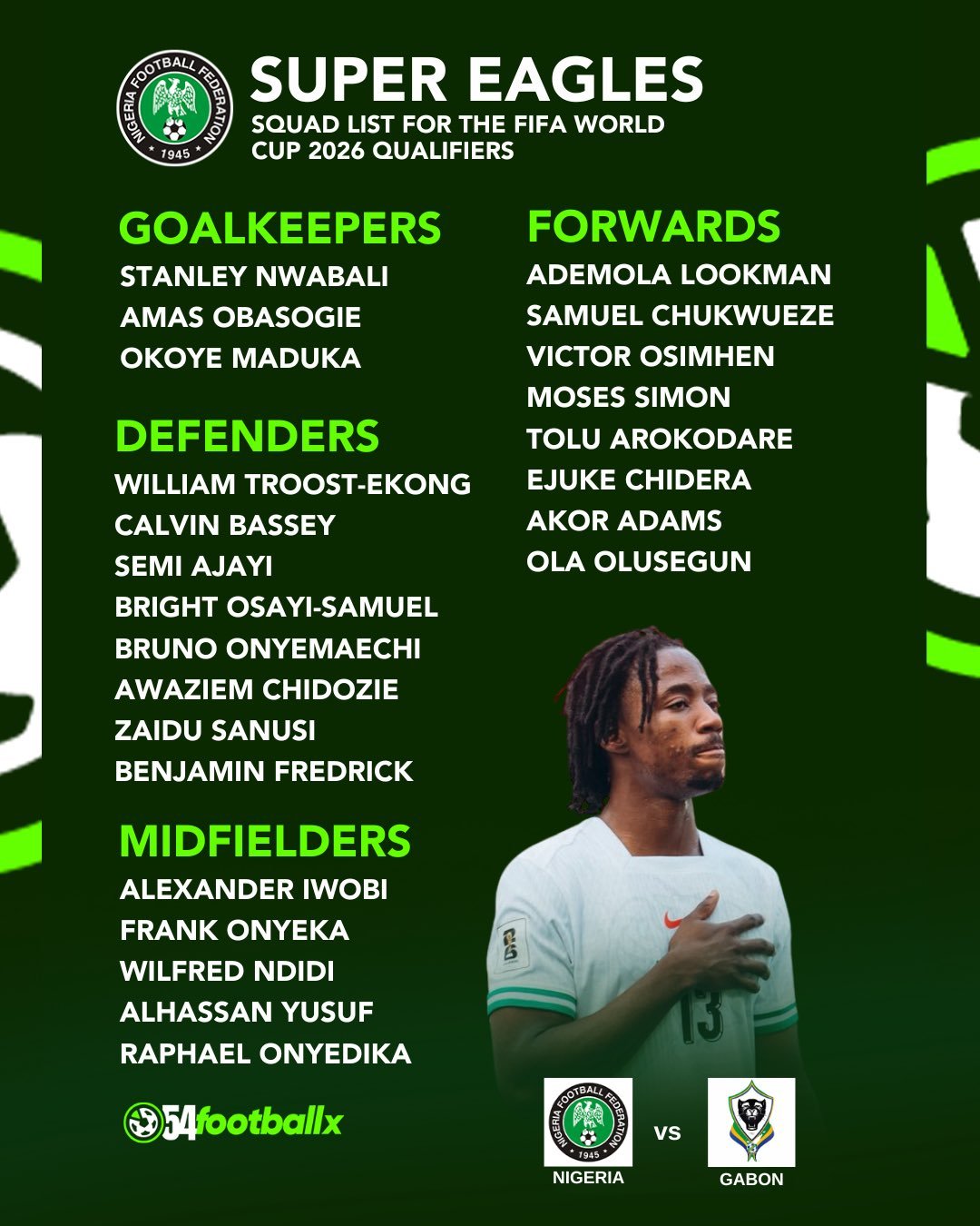 Forwards: Ademola Lookman (Atalanta, Italy), Samuel Chukwueze (Fulham, England), Victor Osimhen (Galatasaray, Turkey), Simon Moses (Paris FC, France), Chidera Ejuke (Sevilla, Spain), Tolu Arokodare (Wolves, England), Akor Adams (Sevilla, Spain), Olakunle Olusegun (Pari Nizhny Novgorod, Russia)