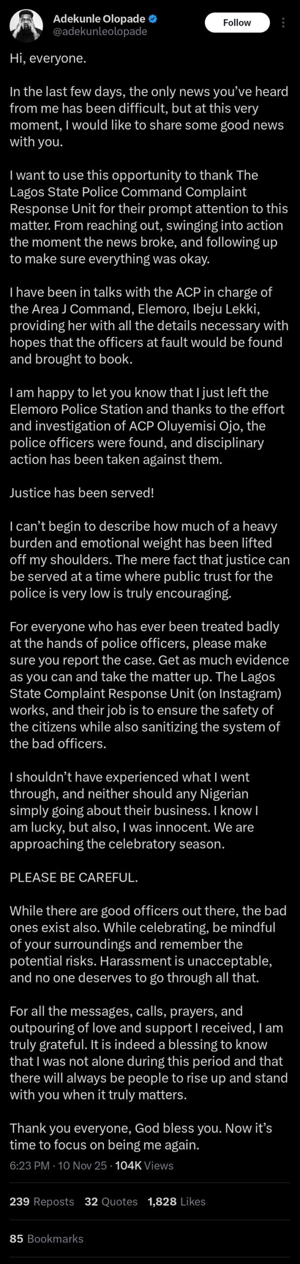 In a post on X, Adekunle thanked the Lagos State Police Command Complaint Response Unit and ACP Oluyemisi Ojo of the Area J Command, Elemoro, Ibeju Lekki, for their prompt investigation, which led to the identification and disciplinary action against the officers responsible.