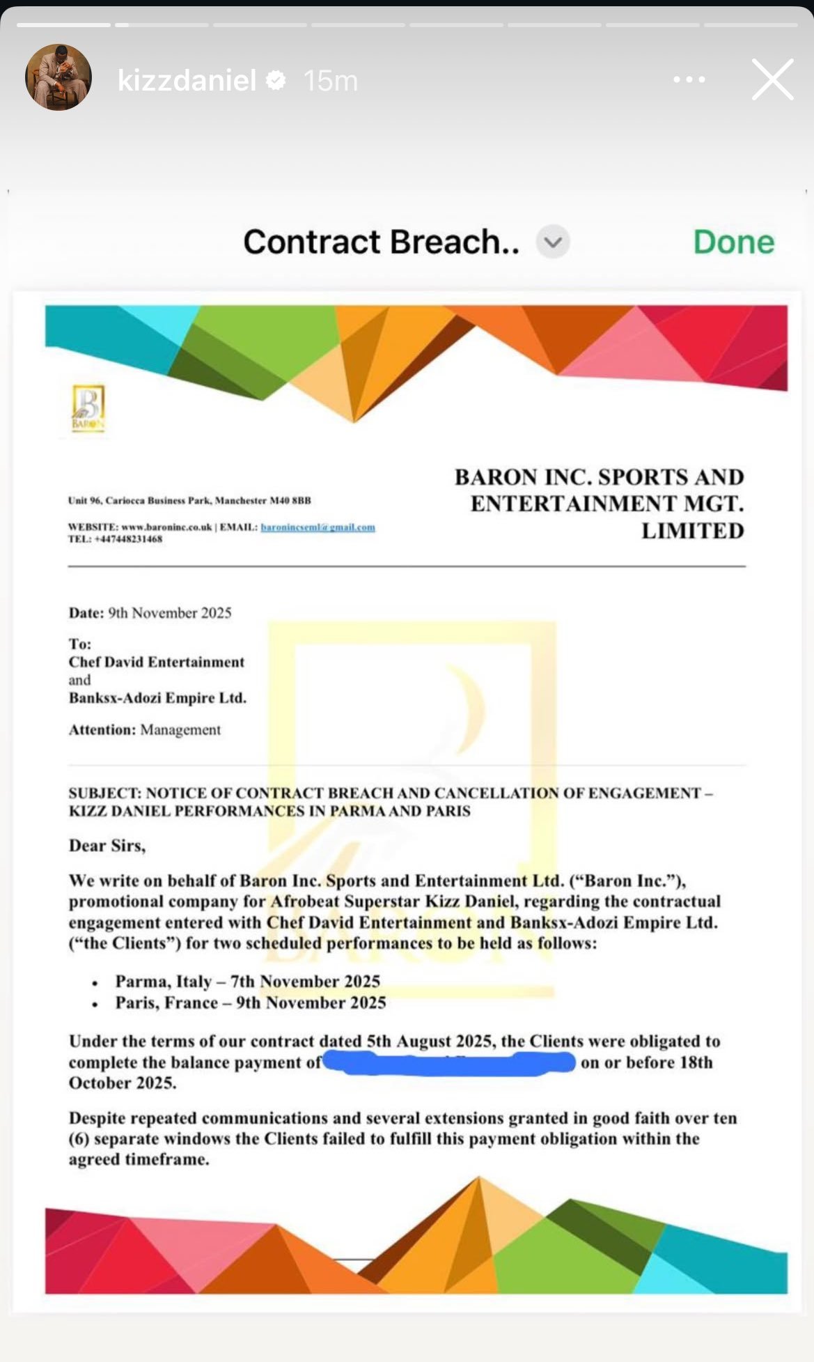 “FSHALAYE. First, this wasn’t my fault. Whatever clips you’re seeing is a dispute between my tour agent @olamidebaron and the show promoter. I was paid in full by @olamidebaron to perform in Paris. He sold the show to another promoter, who allegedly breached the contract by not paying the balance. I will be posting the notice of breach of contract.”
