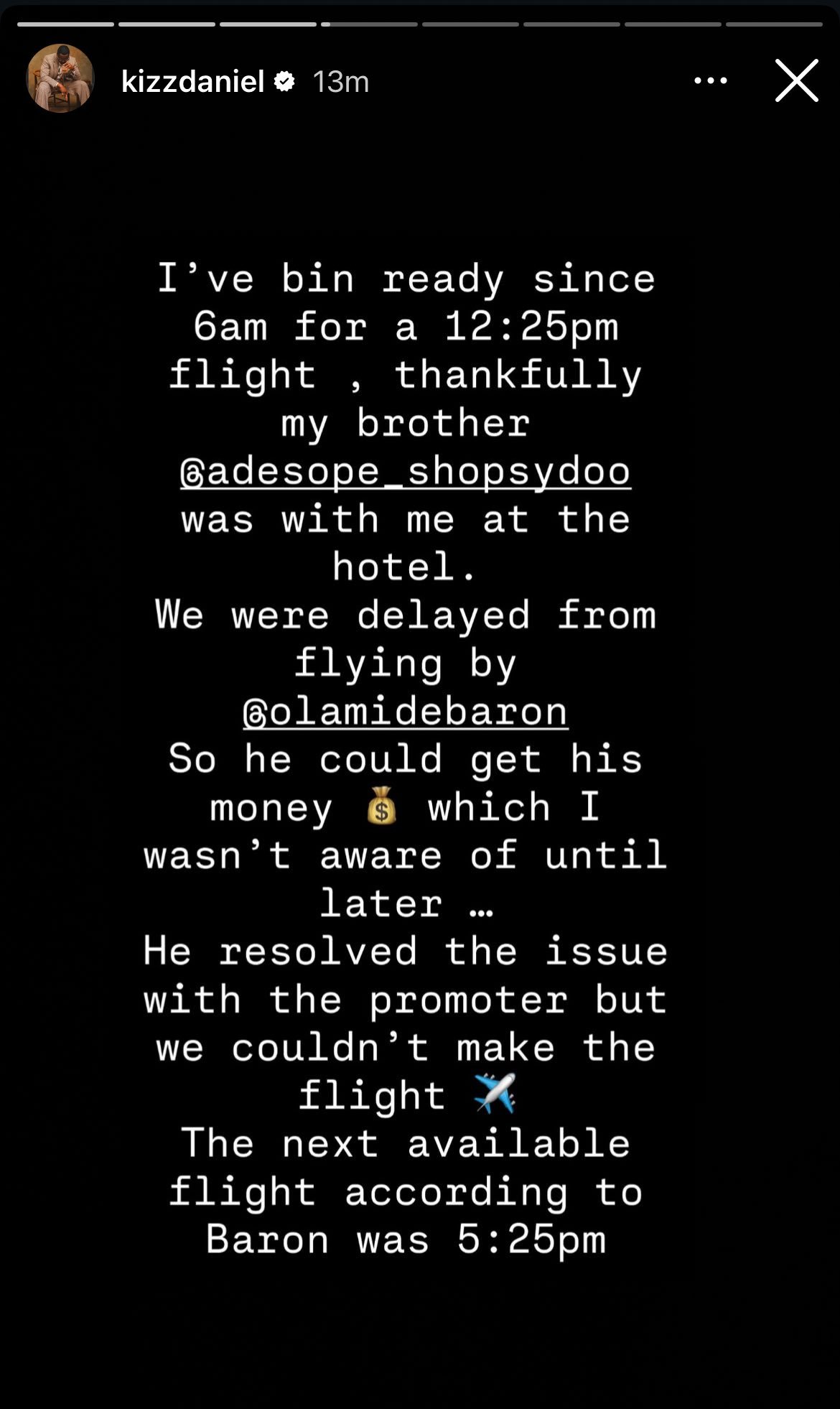 “I was ready since 6 am for a 12:25 pm flight. Thankfully, my brother @adesope_shopsydoo was with me at the hotel. We were delayed from flying by @olamidebaron so he could secure his payment, which I wasn’t aware of until later. The issue was eventually resolved with the promoter, but we missed our flight. The next available flight, according to Baron, was at 5:25 pm.”