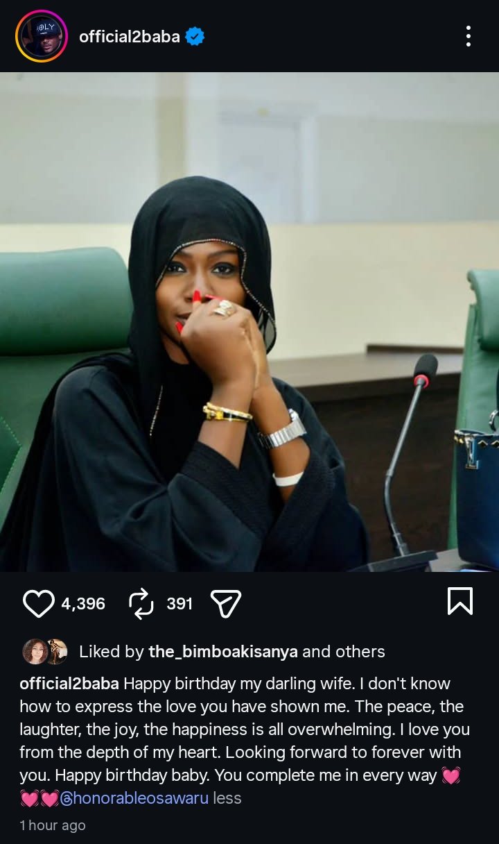 Nigerian music legend 2Baba has celebrated his fiancée, Natasha Osawaru, on her birthday with a heartfelt message, expressing his deep love and gratitude for her presence in his life.