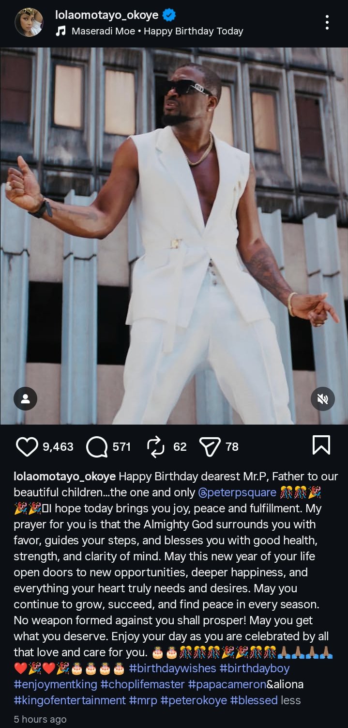 Lola Omotayo-Okoye took to Instagram to celebrate her husband, Peter Mr. P Okoye, on his birthday with a heartfelt tribute. She called him “dearest Mr. P, father to our beautiful children,” expressing love and admiration for both the man and the father he is.