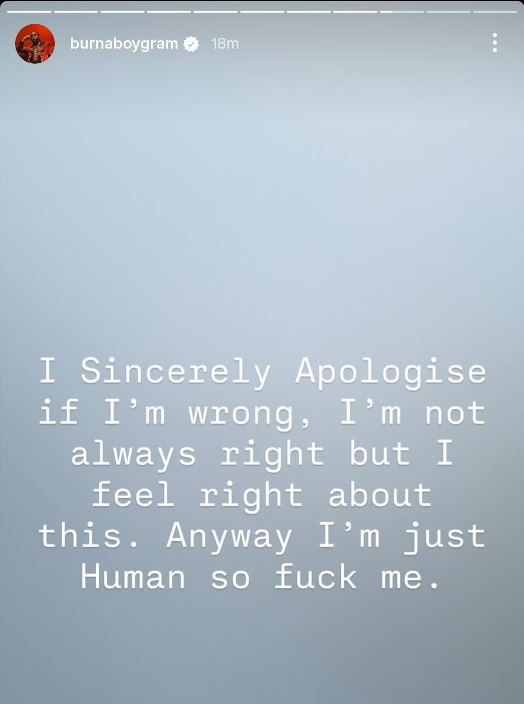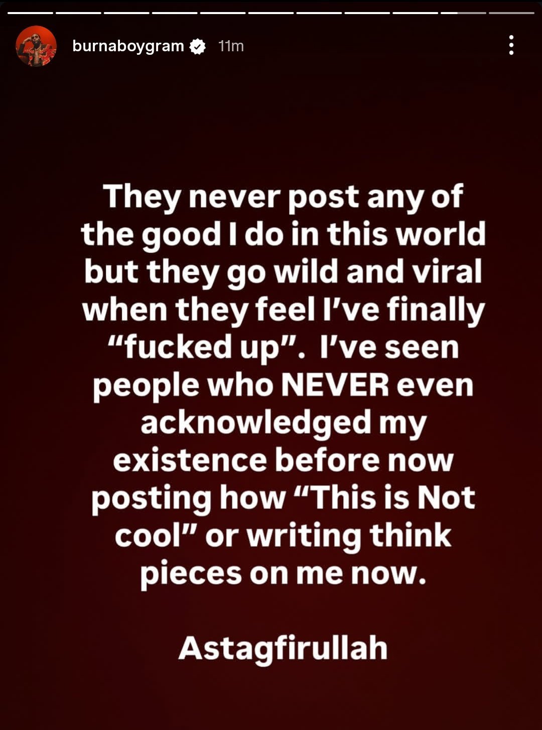 Burna Boy has taken to Instagram to address the backlash he received after commenting that no one should feel obligated to be his fan following an incident at one of his shows where a couple was reportedly sleeping.