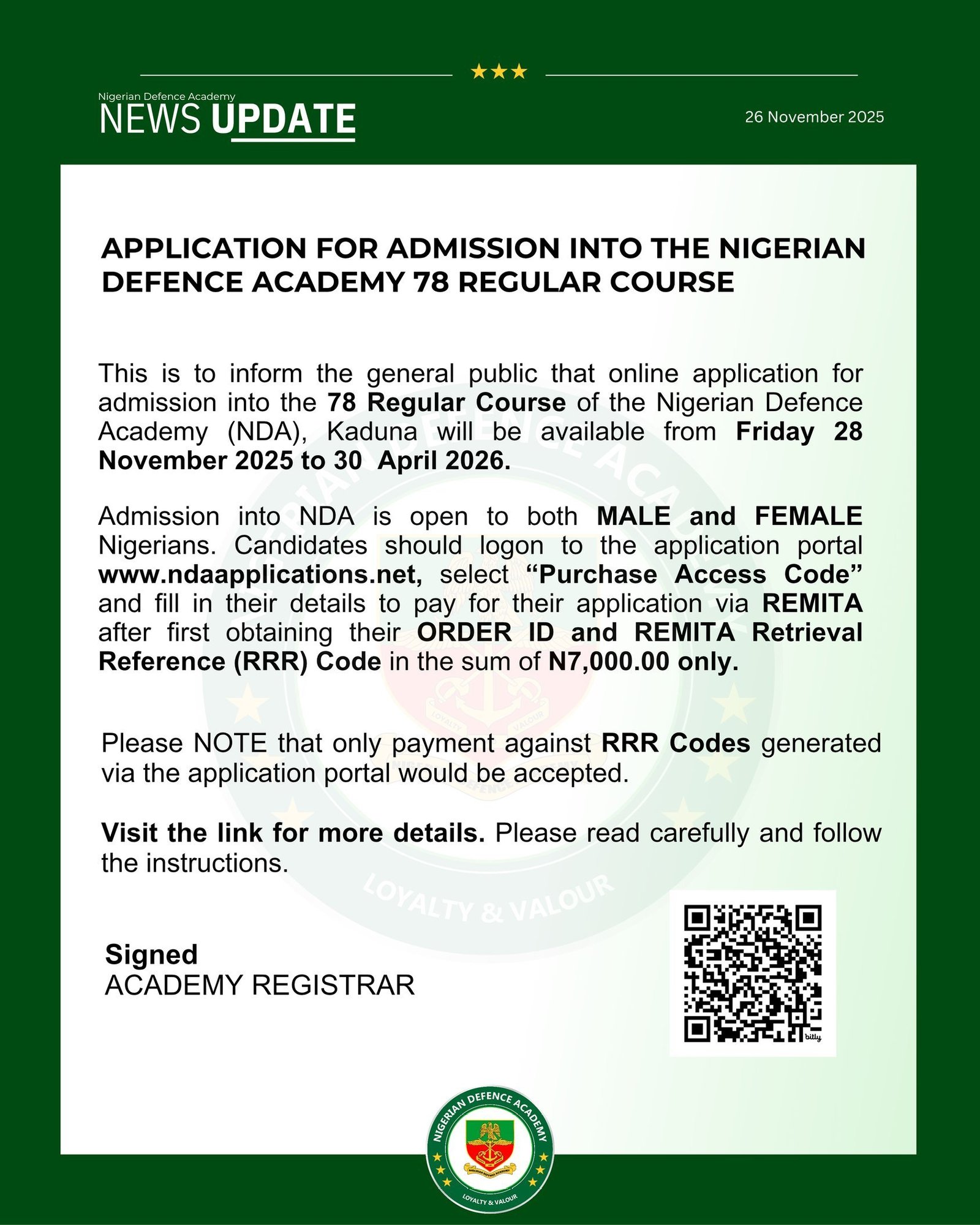 The statement said, “Online application for admission into the 78 Regular Course of the Nigerian Defence Academy (NDA), Kaduna, will commence on Friday, 28 November 2025 and close on 30 April 2026. Admission is open to both MALE and FEMALE Nigerians.”