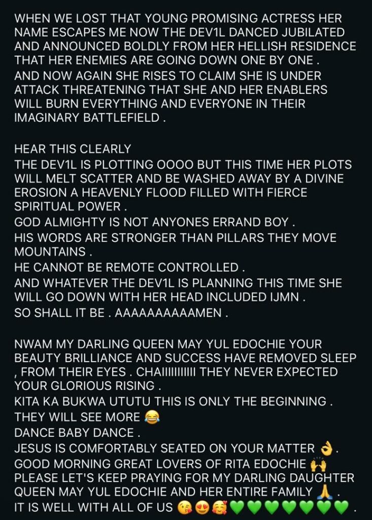 Judy’s initial post suggested she was under spiritual assault and that those behind the alleged attacks would soon face consequences. Her claim immediately stirred reactions, especially because similar outbursts in the past have been followed by family drama involving Yul Edochie’s household.
