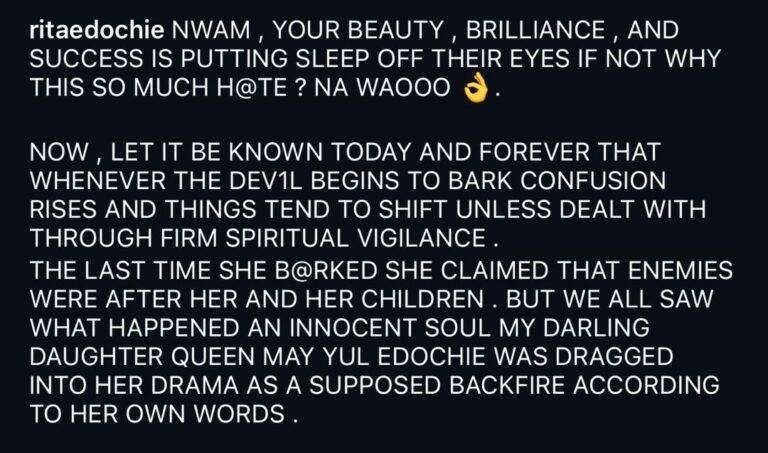 Rita Edochie has taken a direct swipe at Judy Austin after Judy went online with a cryptic message alleging that a “witch and her coven” were attacking her and her family. Though Judy avoided mentioning any names, the tone of her post made it clear to many who the target was — and Rita responded with a long, fiery message loaded with spiritual warnings.
