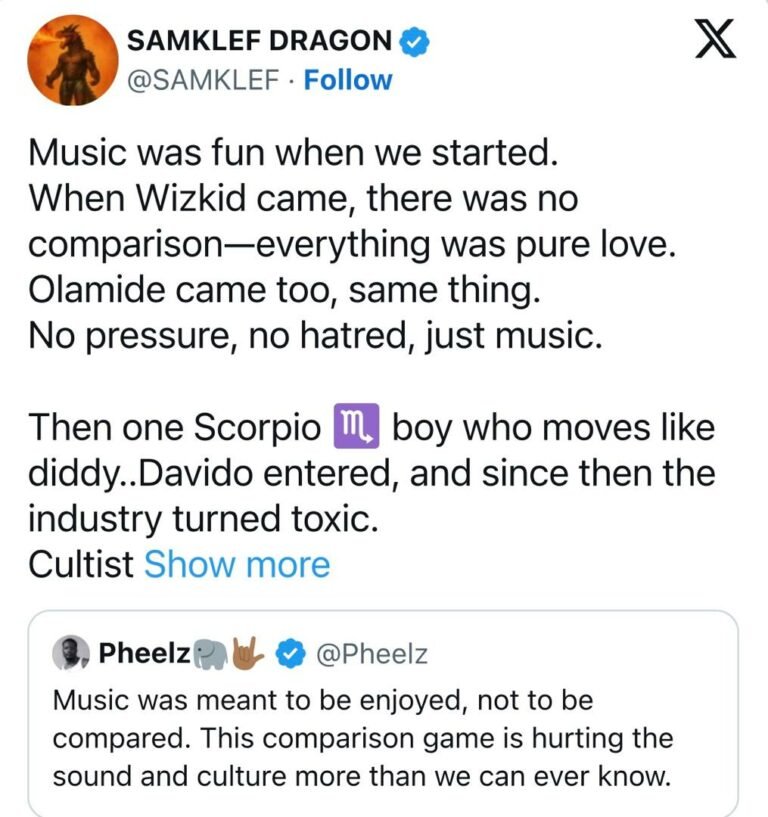 Then one Scorpio boy who moves like Diddy… Davido entered, and since then the industry turned toxic. Cultist mindset, threats, fake streams, dirty moves everywhere.”