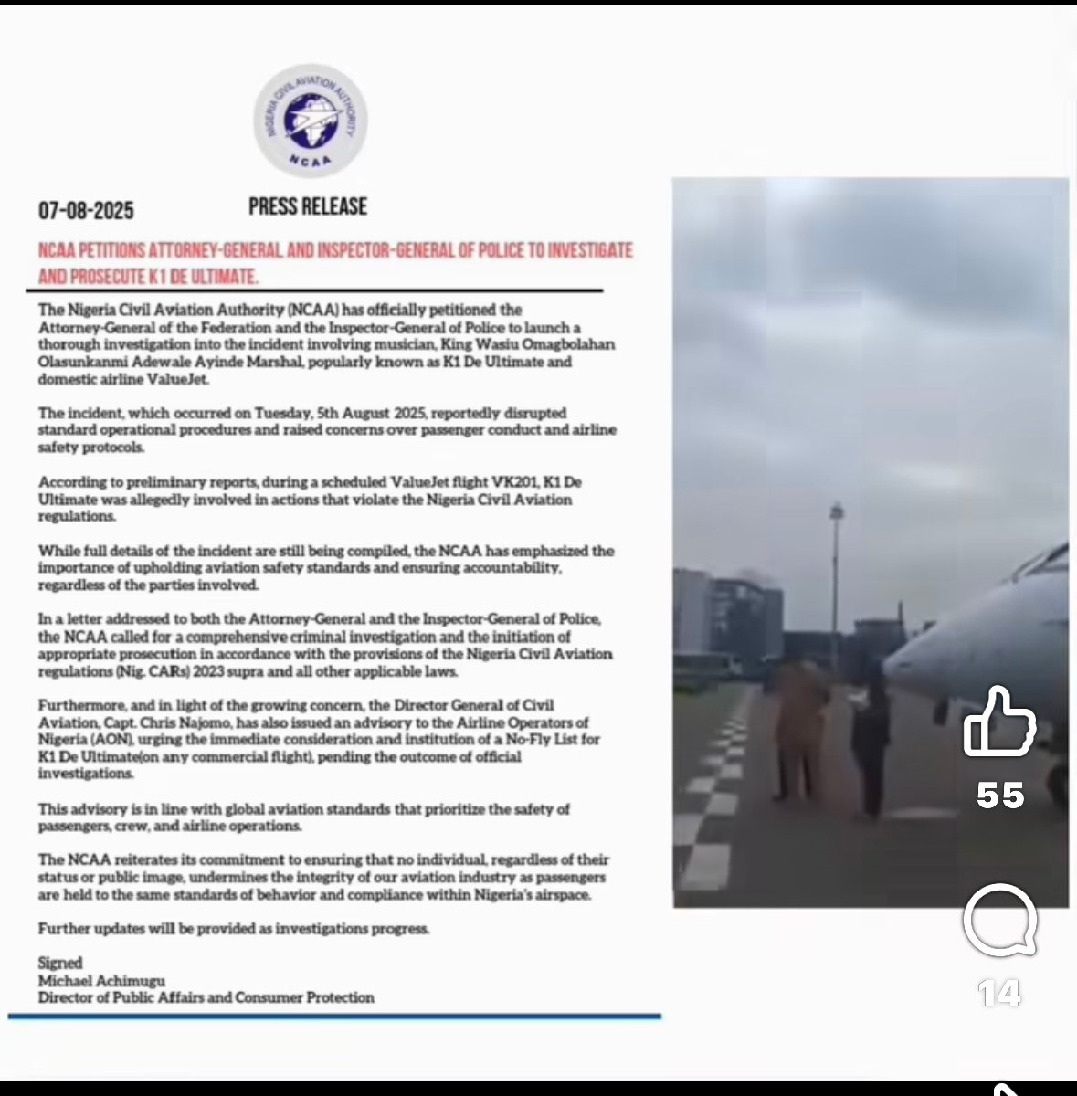 Furthermore, and in light of the growing concern, the Director General of Civil Aviation, Capt. Chris Najomo, has also issued an advisory to the Airline Operators of Nigeria (AON), urging the immediate consideration and institution of a No-Fly List for K1 De Ultimate(on any commercial flight), pending the outcome of official investigations.