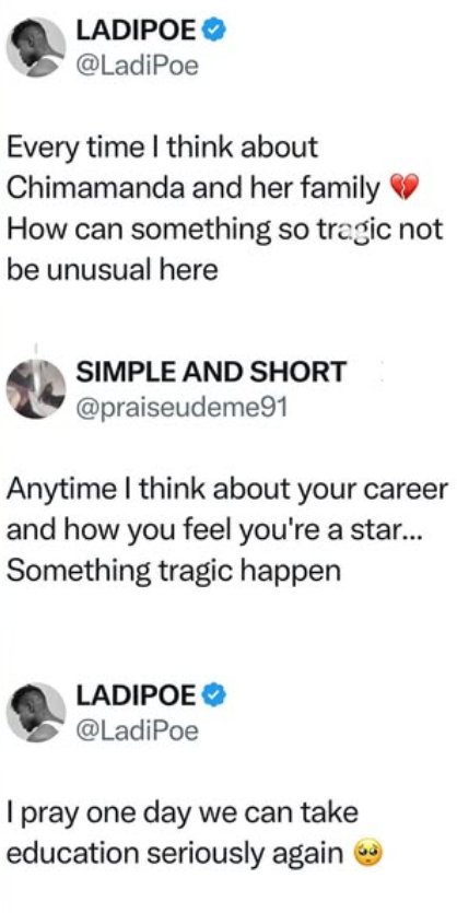 The exchange came amid widespread public condolences for Chimamanda’s loss of her 21-month-old son, Nkanu Nnamdi, prompting many to share messages of empathy. Ladipoe’s measured reply reminded social media users that grief and compassion should not be trivialized.