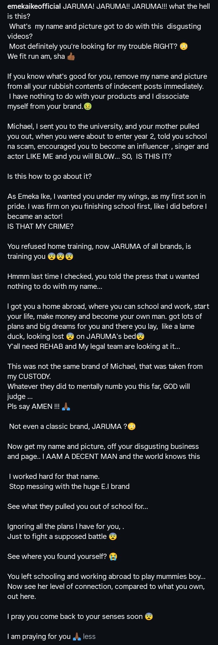 Nollywood actor Emeka Ike has publicly accused popular aphrodisiac seller and therapist Jaruma of misleading his son, Michael, into producing explicit videos on social media. He claimed that Jaruma is using his name and image to promote the content, which he described as indecent.