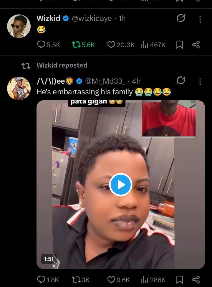 Wizkid posted the same video on his Instagram story and later returned to X to drop a single laughing emoji (😂), which sparked a flurry of reactions from fans and social media users.