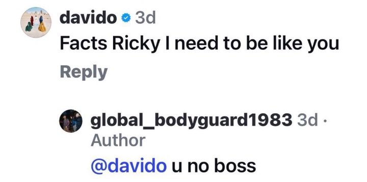 Ricky responded playfully to Davido, writing: “@davido u no boss.”