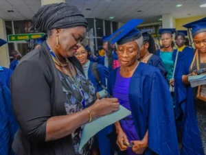 “Dressed in her matriculation gown and cap, Mrs Akomolafe — a retired Data Processing Officer from R.T. Briscoe Motor Company — smiled brightly as cameras captured her joining the newest members of Nigeria’s premier university.