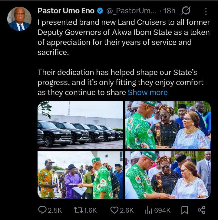 “I presented brand new Land Cruisers to all former Deputy Governors of Akwa Ibom State as a token of appreciation for their years of service and sacrifice,” he wrote, adding that their dedication played a role in shaping the state’s progress and deserved to be rewarded with comfort and convenience.
