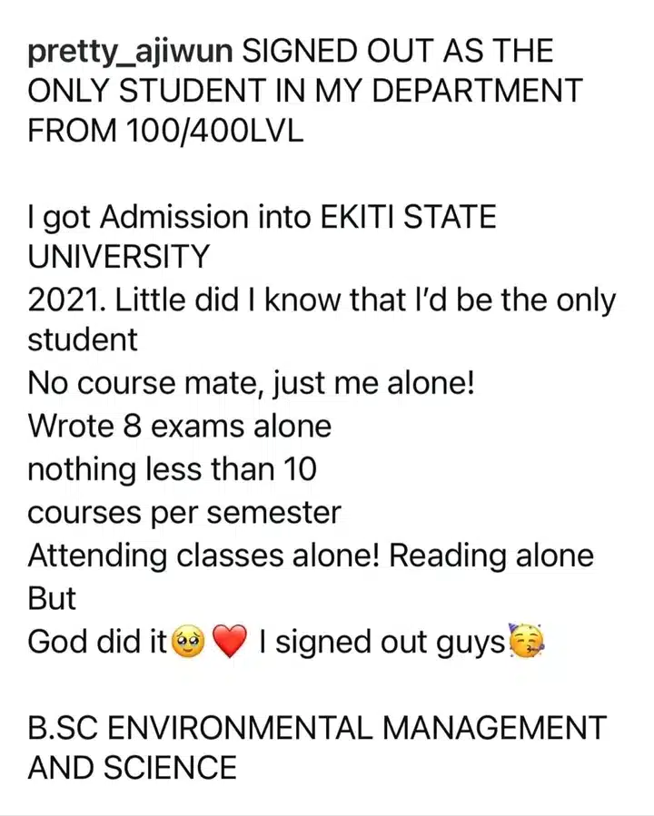 “Signed out as the only student in my department from 100 to 400 level. I got admission into Ekiti State University in 2021. Little did I know I’d be the only student. No course mate, just me alone! Attending classes alone, reading alone. But God did it. I signed out, guys. B.Sc Environmental Management and Science.”
