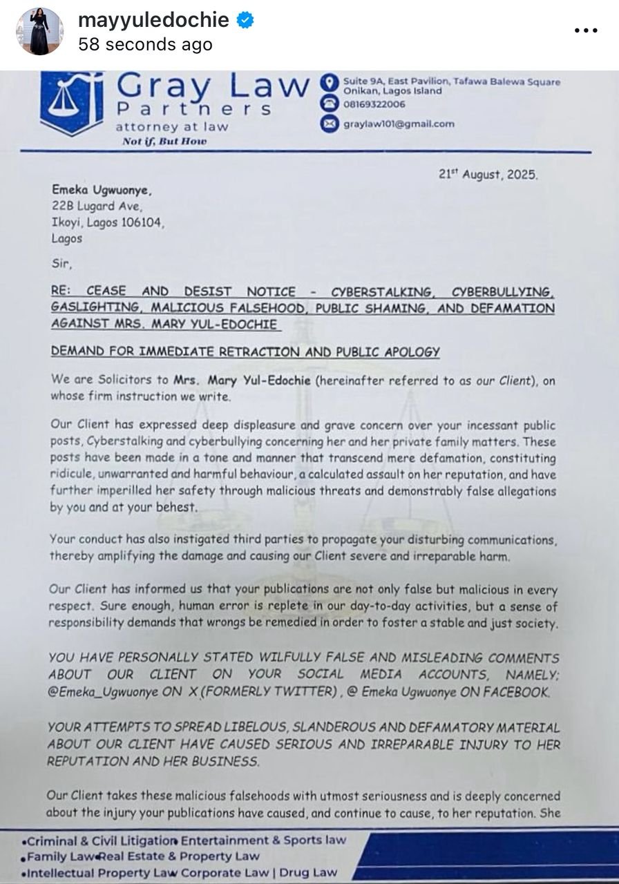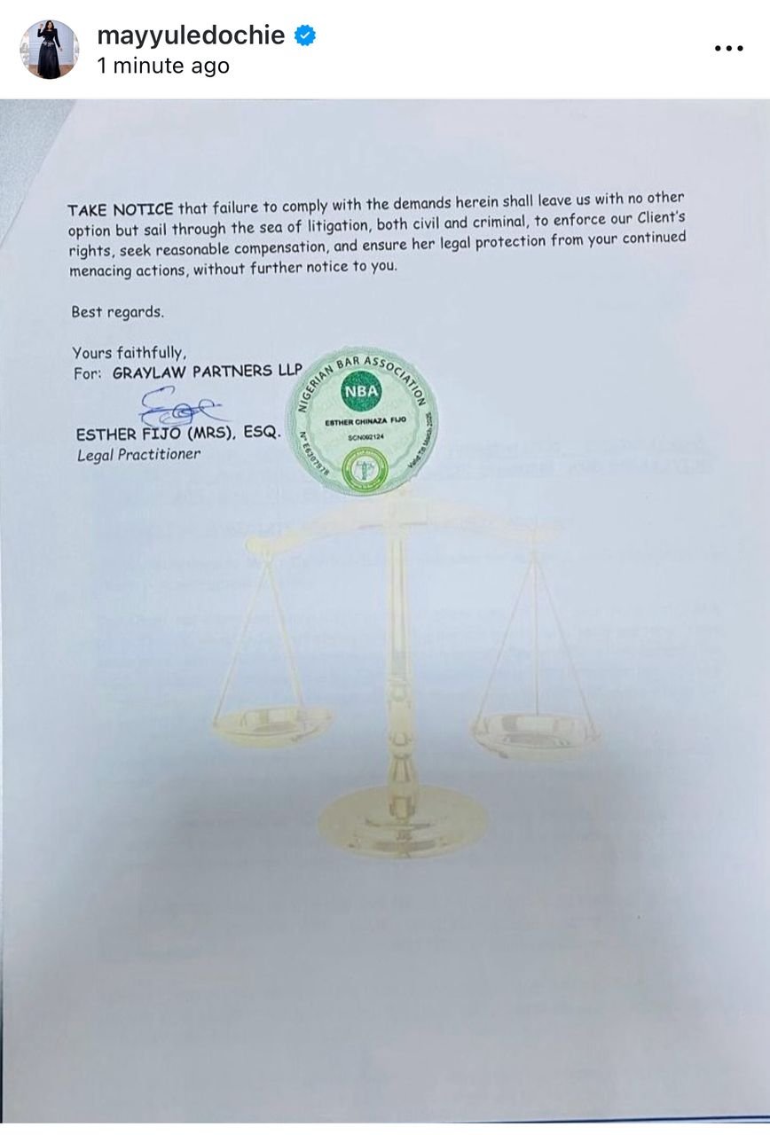 In a cease-and-desist letter sent through her legal team, Graylaw Partners, May alleged that Ugwuonye has been spreading false and damaging claims about her on social media, describing his actions as a deliberate attack on her reputation and personal safety.