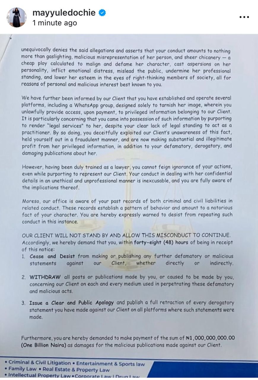 May’s demands include the immediate removal of all defamatory posts, a public apology and retraction across all platforms, and the payment of ₦1 billion in damages.