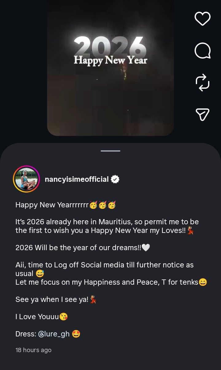 “Happy New Yearrrrrrr. It’s 2026 already here in Mauritius, so permit me to be the first to wish you a Happy New Year, my Loves!! 2026 will be the year of our dreams!! Aii, time to log off Social media till further notice, as usual. Let me focus on my Happiness and Peace, T for thanks. See ya when I see y’all. I Love Youuu,” she wrote.