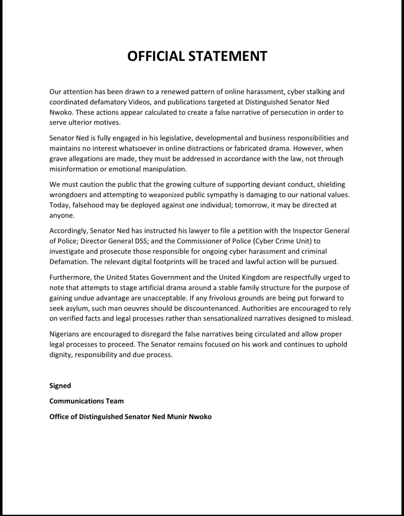 “Our attention has been drawn to a renewed pattern of online harassment, cyber stalking and coordinated defamatory videos and publications targeted at Distinguished Senator Ned Nwoko. These actions appear calculated to create a false narrative of persecution in order to serve ulterior motives.”