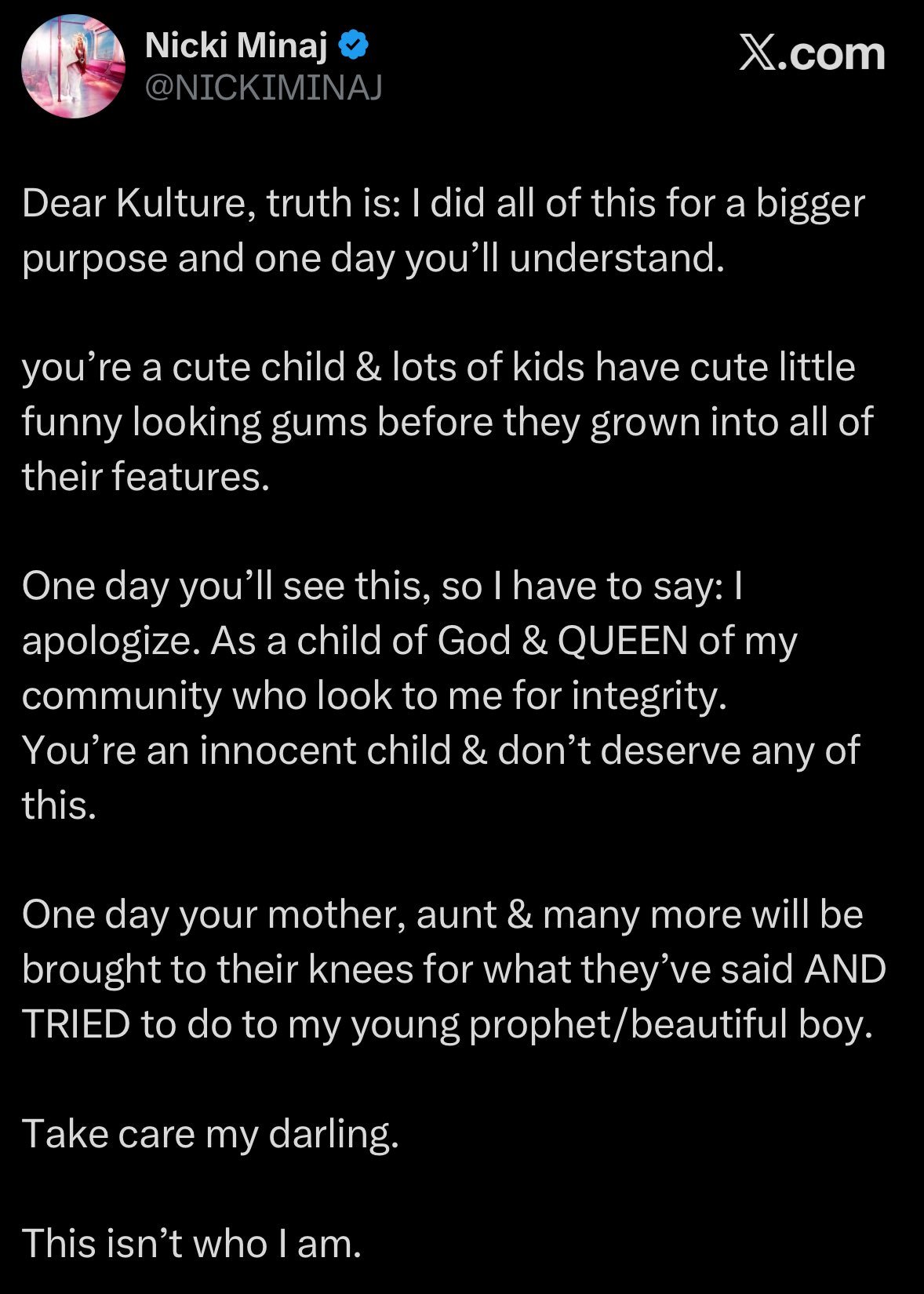 “Dear Kulture, truth is: I did all of this for a bigger purpose and one day you’ll understand. You’re a cute child & lots of kids have cute little funny looking gums before they grow into all of their features. One day you’ll see this, so I have to say: I apologize. As a child of God & QUEEN of my community who look to me for integrity. You’re an innocent child & don’t deserve any of this.”