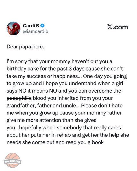 “Dear Papa Perc, I’m sorry that your mommy hasn’t cut you a birthday cake for the past three days because she can’t take my success or happiness… One day when you grow up, I hope you understand that when a girl says NO, it means NO. Please don’t hate me when you grow up. Hopefully, when someone who really cares about her helps her get the help she needs, she will come out and read you a book.”