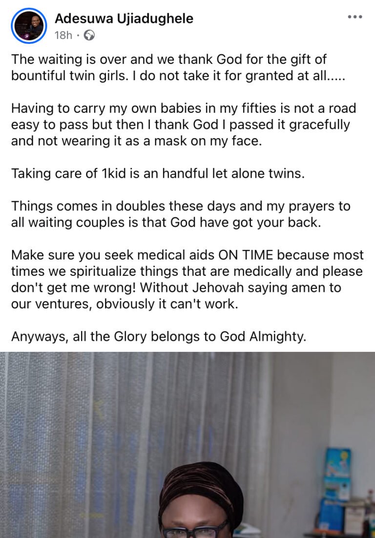 “The waiting is over and we thank God for the gift of bountiful twin girls. I do not take it for granted at all. Having to carry my own babies in my fifties is not a road easy to pass, but then I thank God I passed it gracefully,” she wrote.