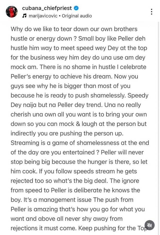 “Why do we like to tear down our own brothers hustle or energy down? Small boy like Peller deh hustle him way to meet speed wey Dey at the top for the business wey him dey do una use am dey mock am. There is no shame in hustle I celebrate Peller’s energy to achieve his dream. Now you guys see why he is bigger than most of you because he is ready to push shamelessly.”