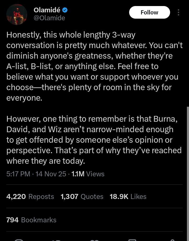 Olamide’s statement has reignited conversations around Afrobeats greatness, with the rapper reminding fans that the genre has space for multiple stars to shine simultaneously.