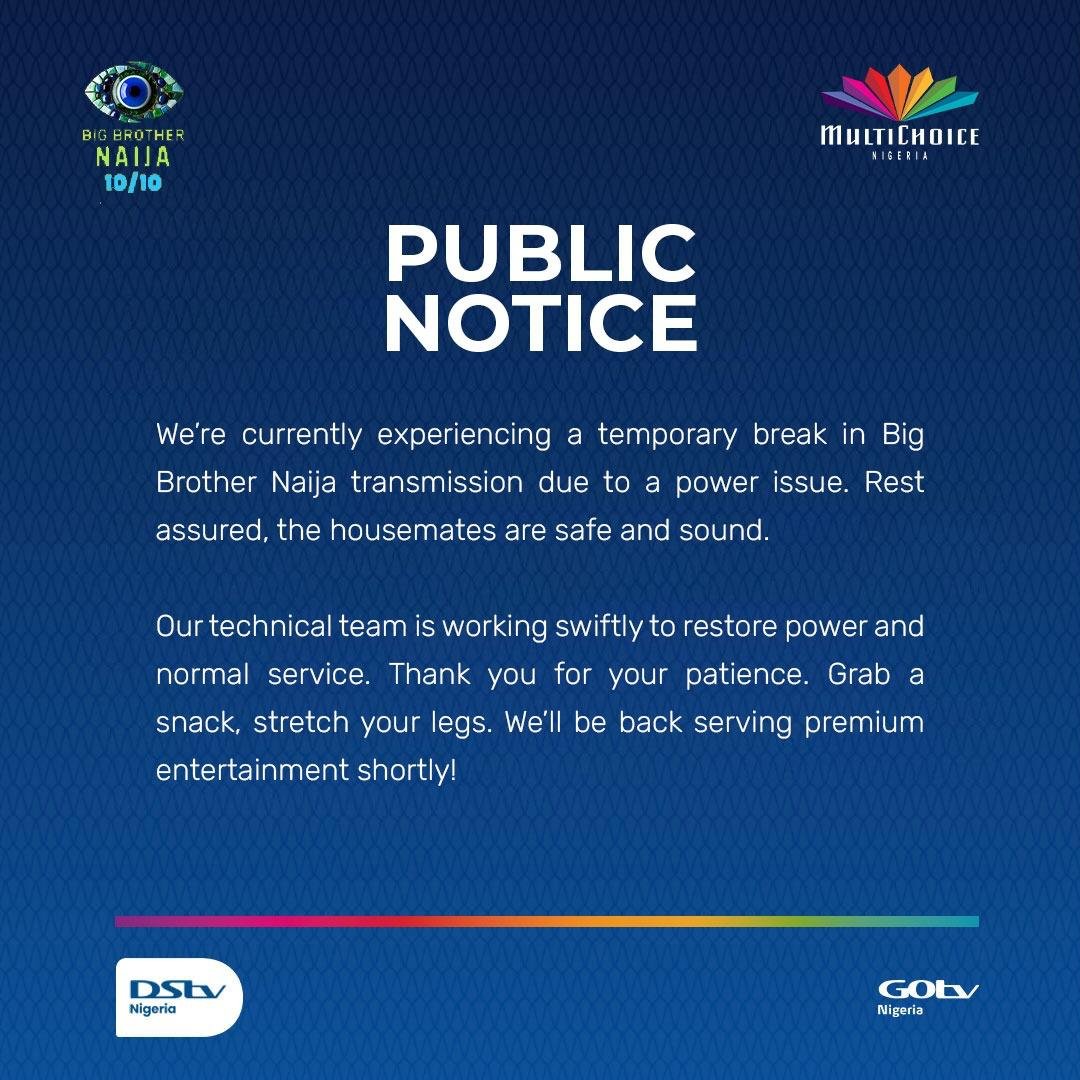 “We are experiencing a temporary break in transmission due to a power issue. The housemates are safe, and our technical team is working hard to restore service. Thank you for your patience—premium entertainment will be back shortly,” the statement read.
