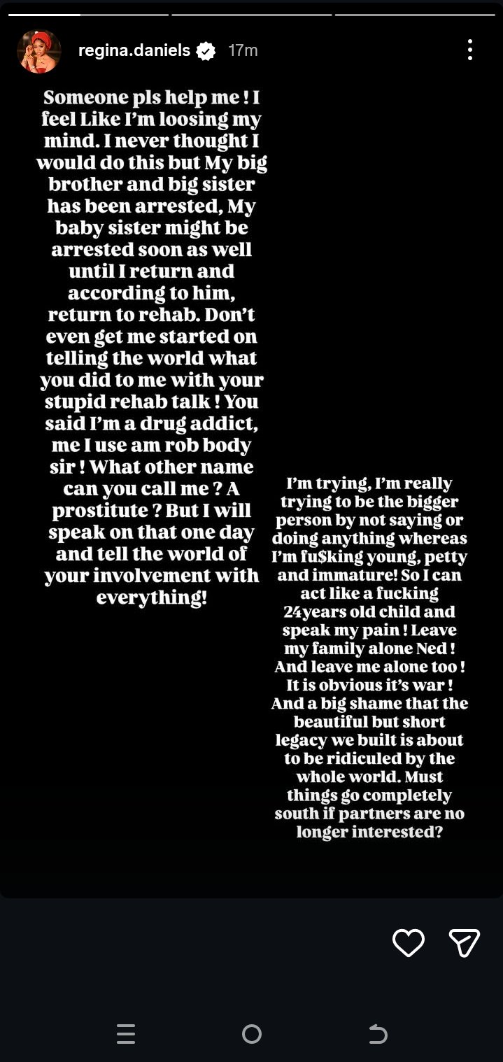 Nollywood actress Regina Daniels has raised alarm over the recent arrests of her siblings amid her ongoing marital struggles with Ned Nwoko.