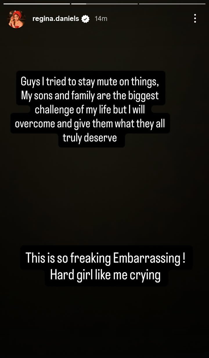 Regina described the situation as deeply distressing, urging Ned Nwoko to leave her family alone. She also acknowledged the strain it has placed on her, saying, “My sons and family are the biggest challenge of my life, but I will overcome and give them what they truly deserve. This is so embarrassing! Hard girl like me crying.”