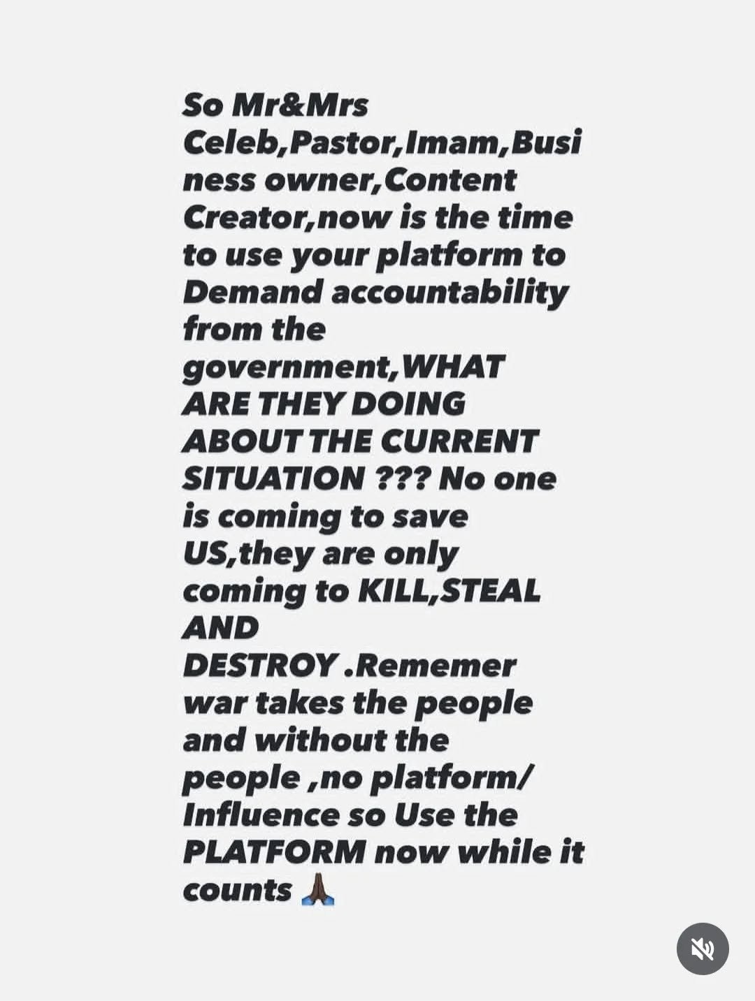 He urged celebrities, religious leaders, business owners, and content creators to speak up and demand accountability from Nigerian authorities instead of waiting for foreign powers to intervene. “No one is coming to save US; they are only coming to KILL, STEAL AND DESTROY. Remember, war takes the people, and without the people, there is no platform or influence. Use the PLATFORM now while it counts,” he added.