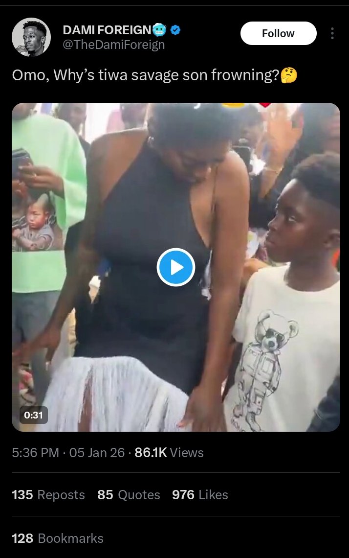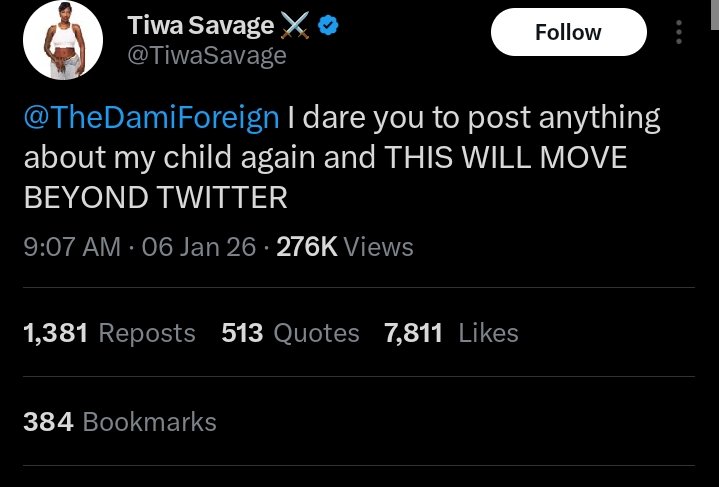 Dami Foreign shared a clip of her child looking upset while she was twerking, captioning it: “Omo, Why’s Tiwa Savage’s son frowning? 🤔”. Tiwa took to X to issue a stern warning, tweeting: “@TheDamiForeign I dare you to post anything about my child again and THIS WILL MOVE BEYOND TWITTER.”