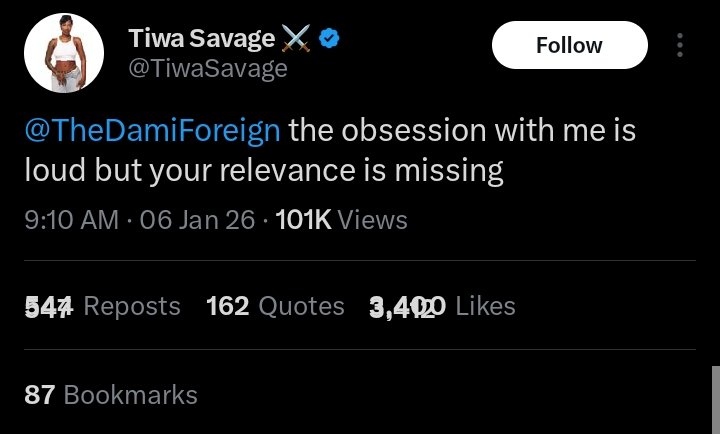 She also addressed what she described as his fixation on her, adding: “@TheDamiForeign the obsession with me is loud but your relevance is missing.”