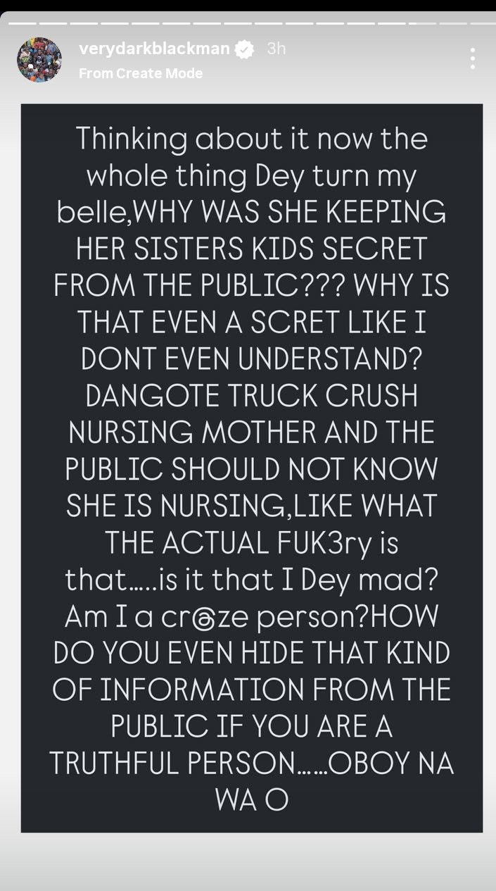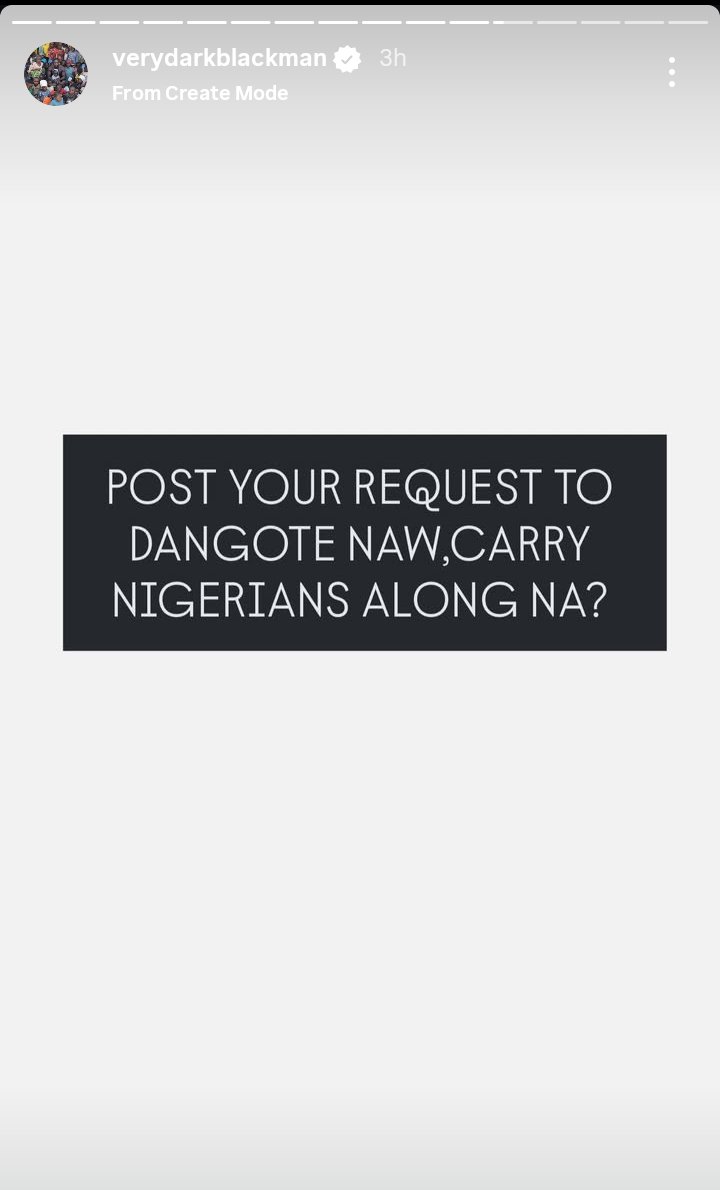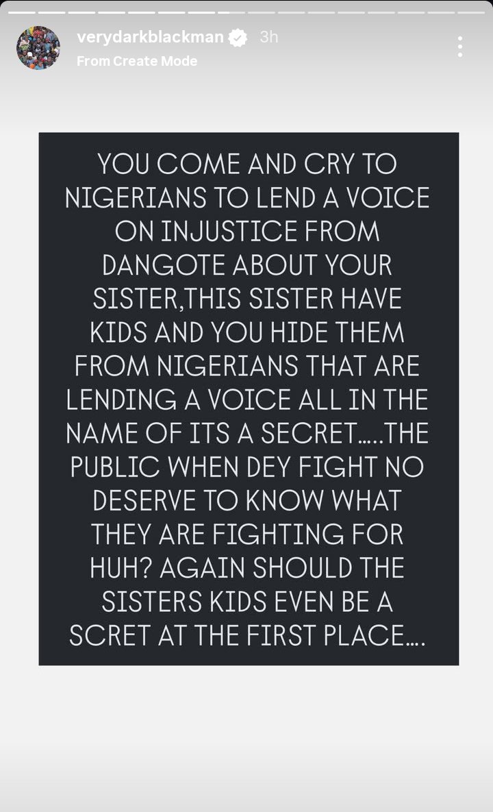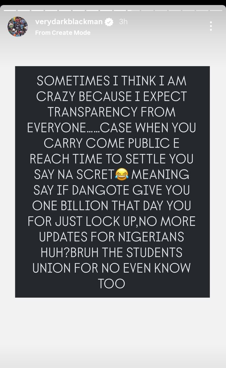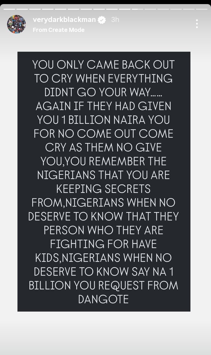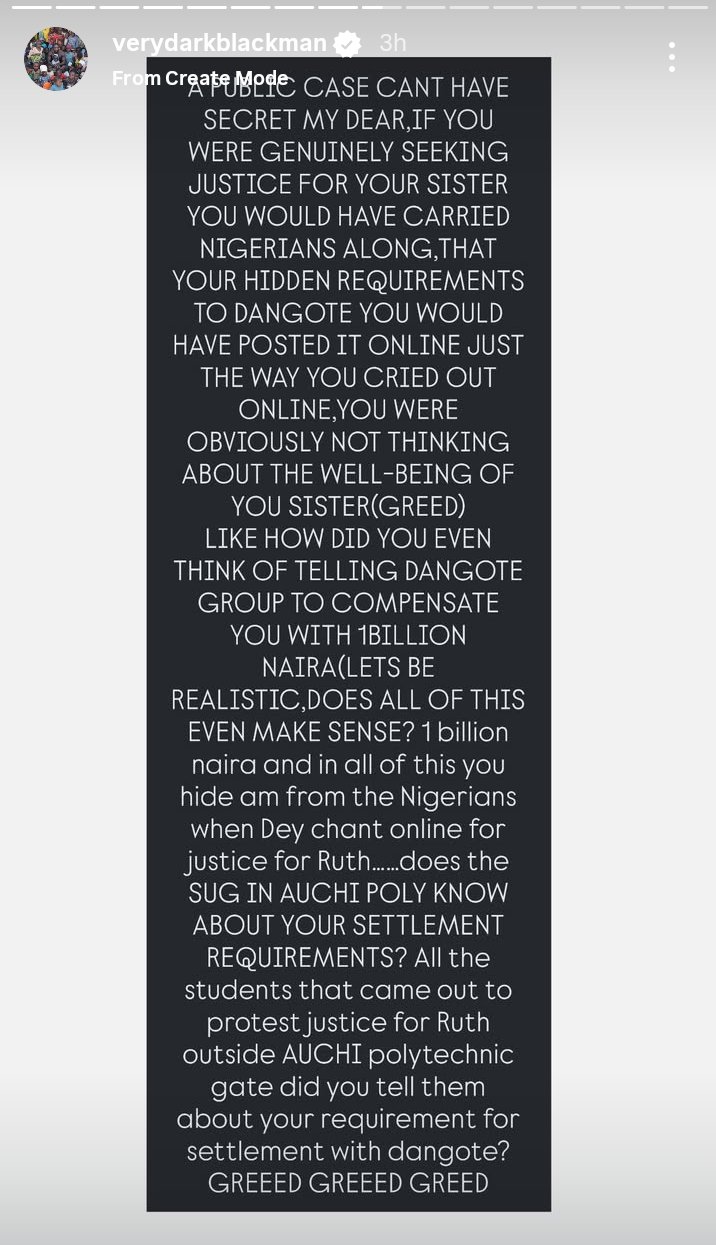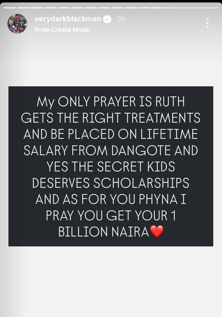 “I have seen the write-ups — everything is clearer now. Money indeed is the root of all evil,” VDM wrote. “If I was involved, I’d push Dangote to fly Ruth abroad for treatment, give her kids scholarships, and even pay her a lifetime salary. But you want ₦1 billion.”