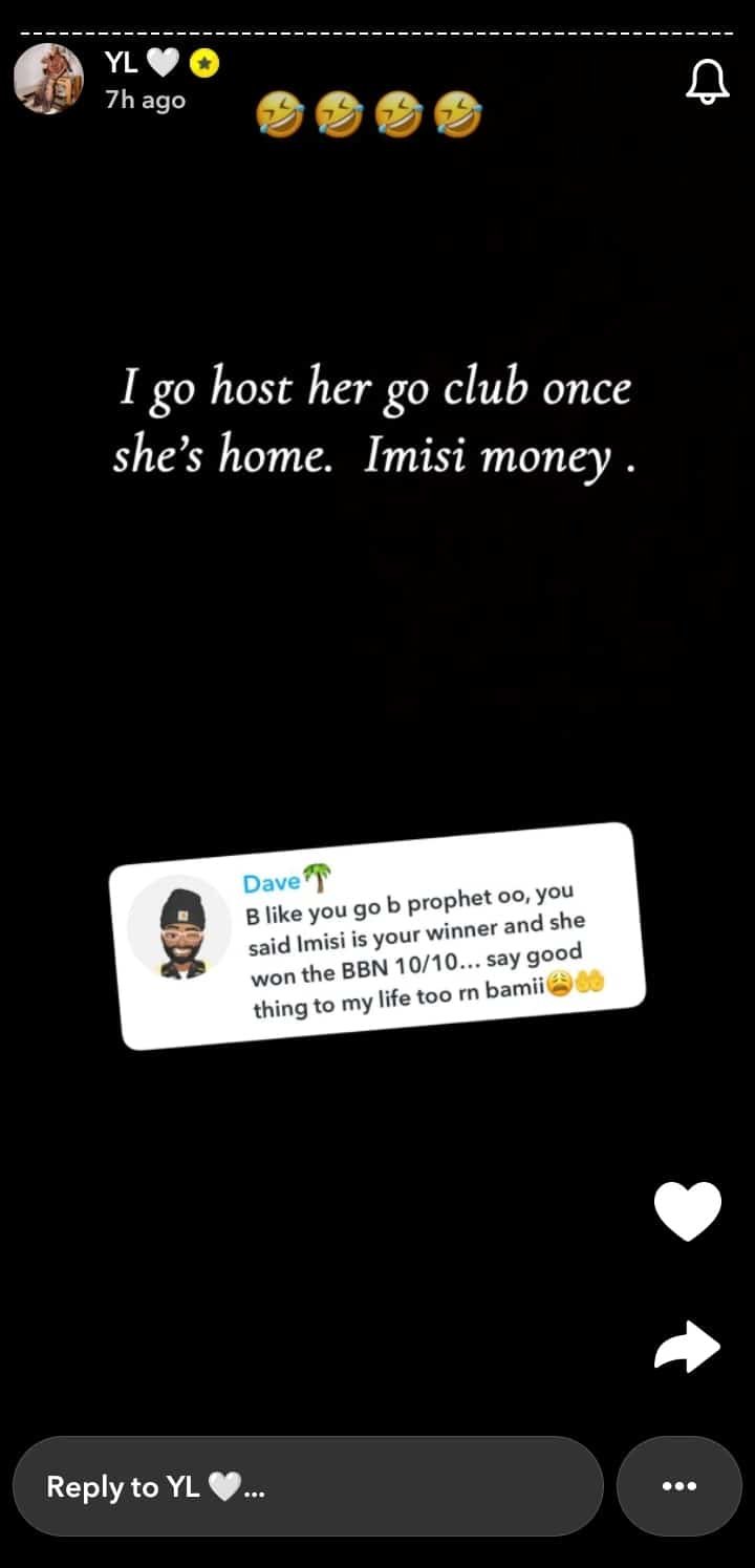 After her win, a fan praised Yhemo Lee on Snapchat for predicting Imisi’s victory, calling him a “prophet” and asking him to speak blessings into their life.